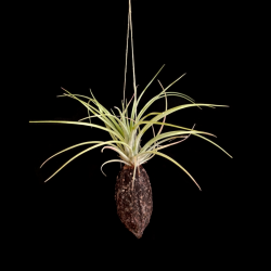 Soporte decorativo para colgar elaborado con vaina de cacao con Tillandsia talla L (T. capitata, T. brachycaulos, T. fasciculata). El soporte incluye un pequeño gancho para colgar.